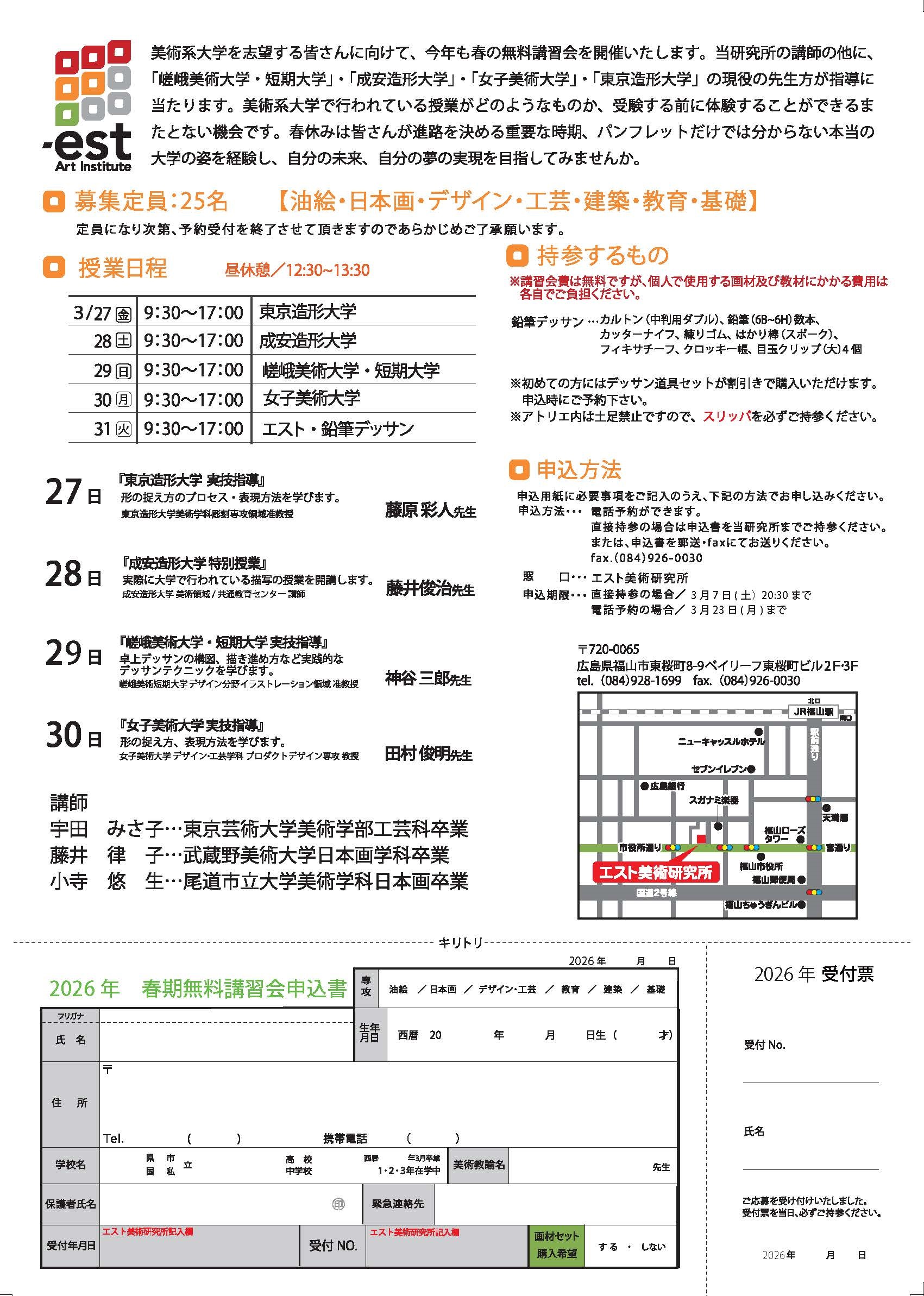 芸大・美大受験に抜群の合格実績をもつエスト美術研究所が、3月27日から2026年度春期無料講習会を行います。